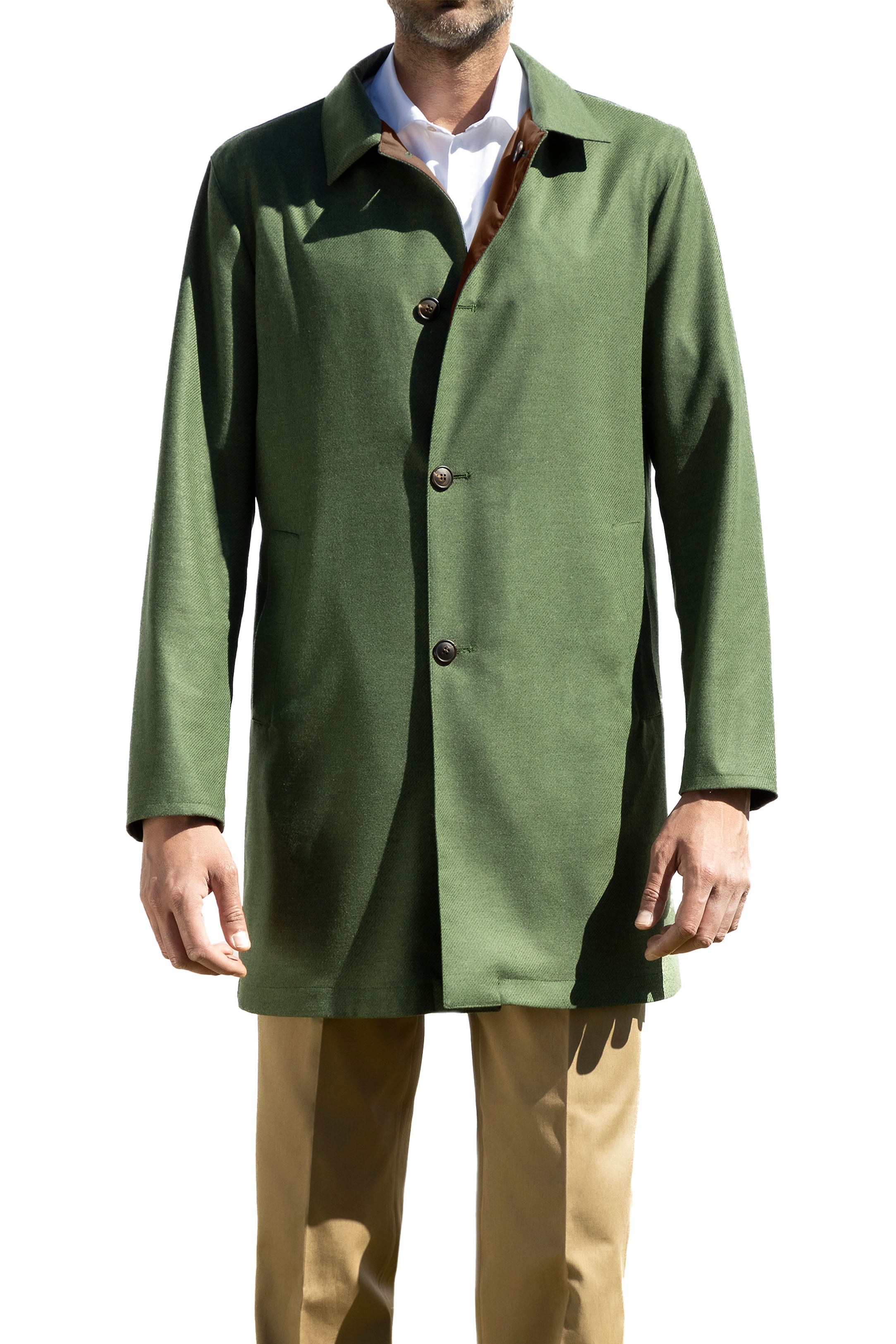 Introducing our signature model, the Lecce coat, a testament to the grandeur of the eponymous city that inspired its creation. This coat stands as a beacon of style and functionality, embodying the essence of our founder, "Mesciu Gigi", and his vision. The Lecce's reversible design offers the versatility of two distinct sides - an exquisite yet durable flannel fabric on one, perfect for everyday wear, and a resilient nylon fabric on the other, providing water-proof features for unpredictable climates. Meticulously crafted with strategic darting, the coat effortlessly molds to the wearer's body, ensuring a tailored fit that exudes sophistication and comfort. A true embodiment of Italian elegance, the Lecce coat pays homage to the city's baroque style and limestone architecture, capturing the spirit of communion where history and tradition converge.