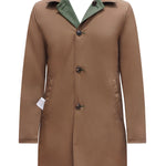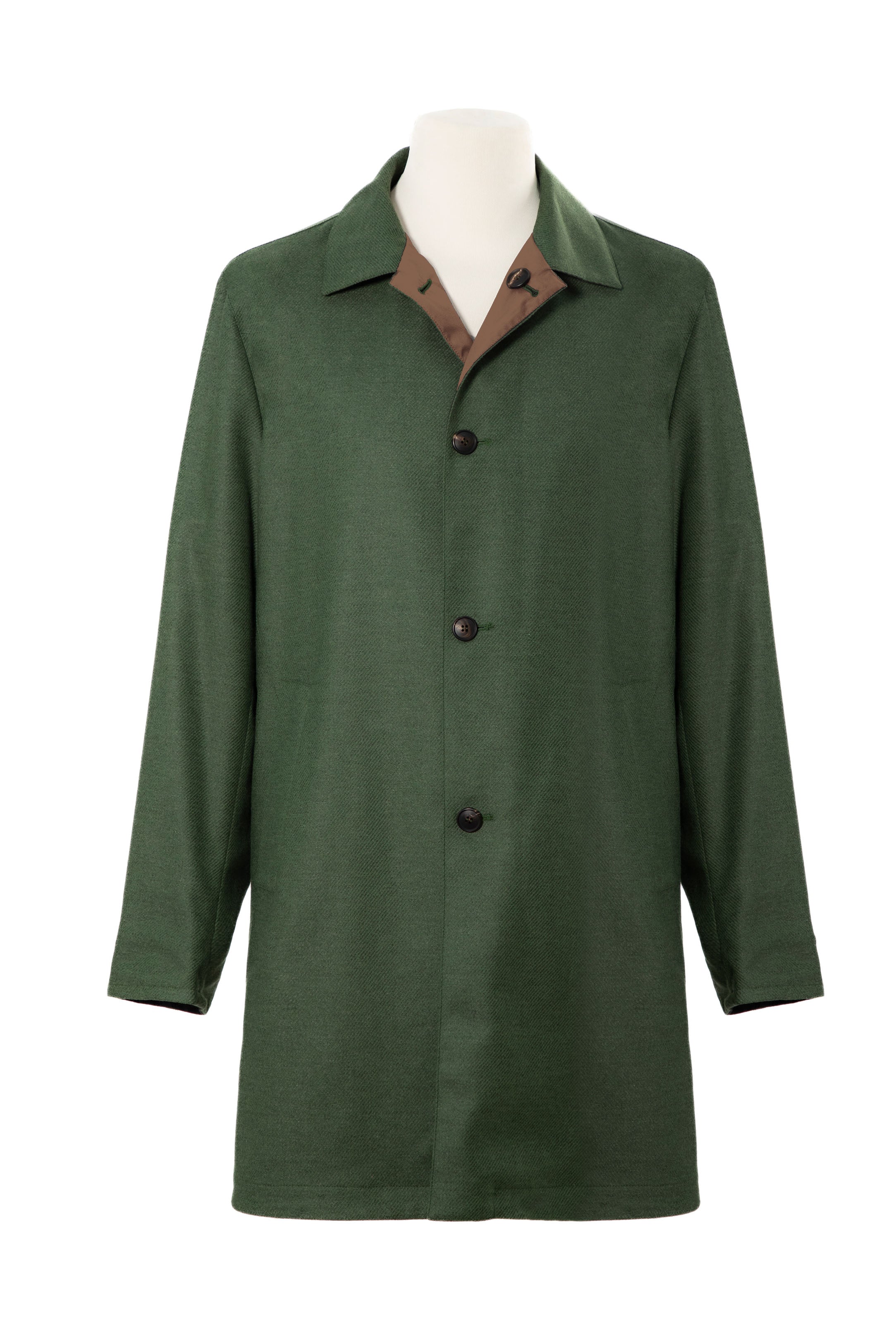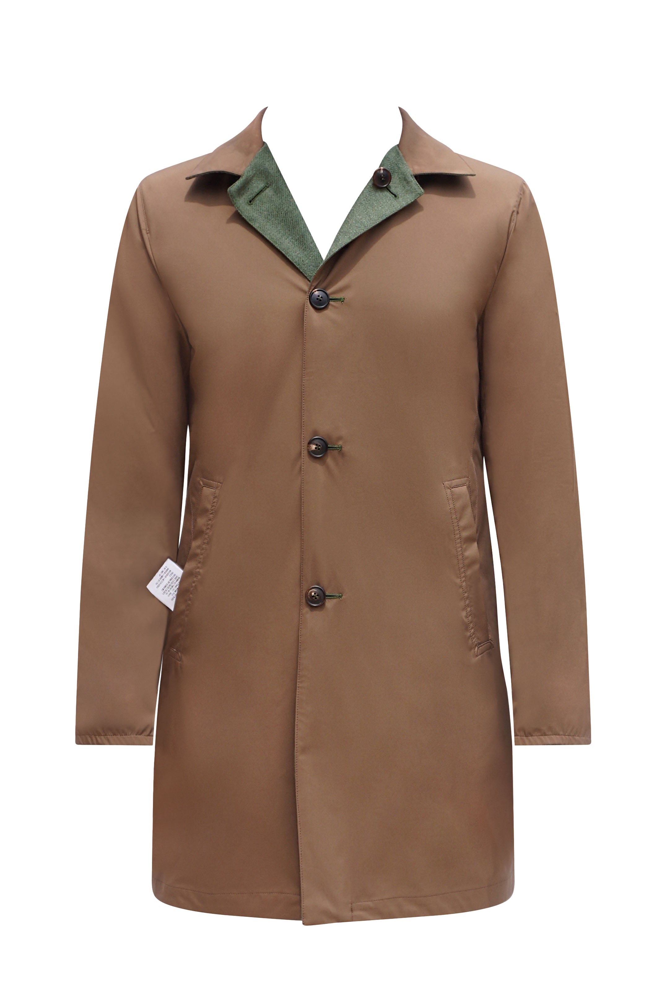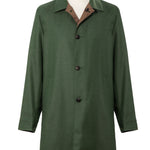 Car Coat; Reversible; Waterproof features; Shirt collar style; Inclined side pockets; Waist darting; One back vent; Genuine horn buttons; Classically constructed sleeves; Hand-sewn buttons