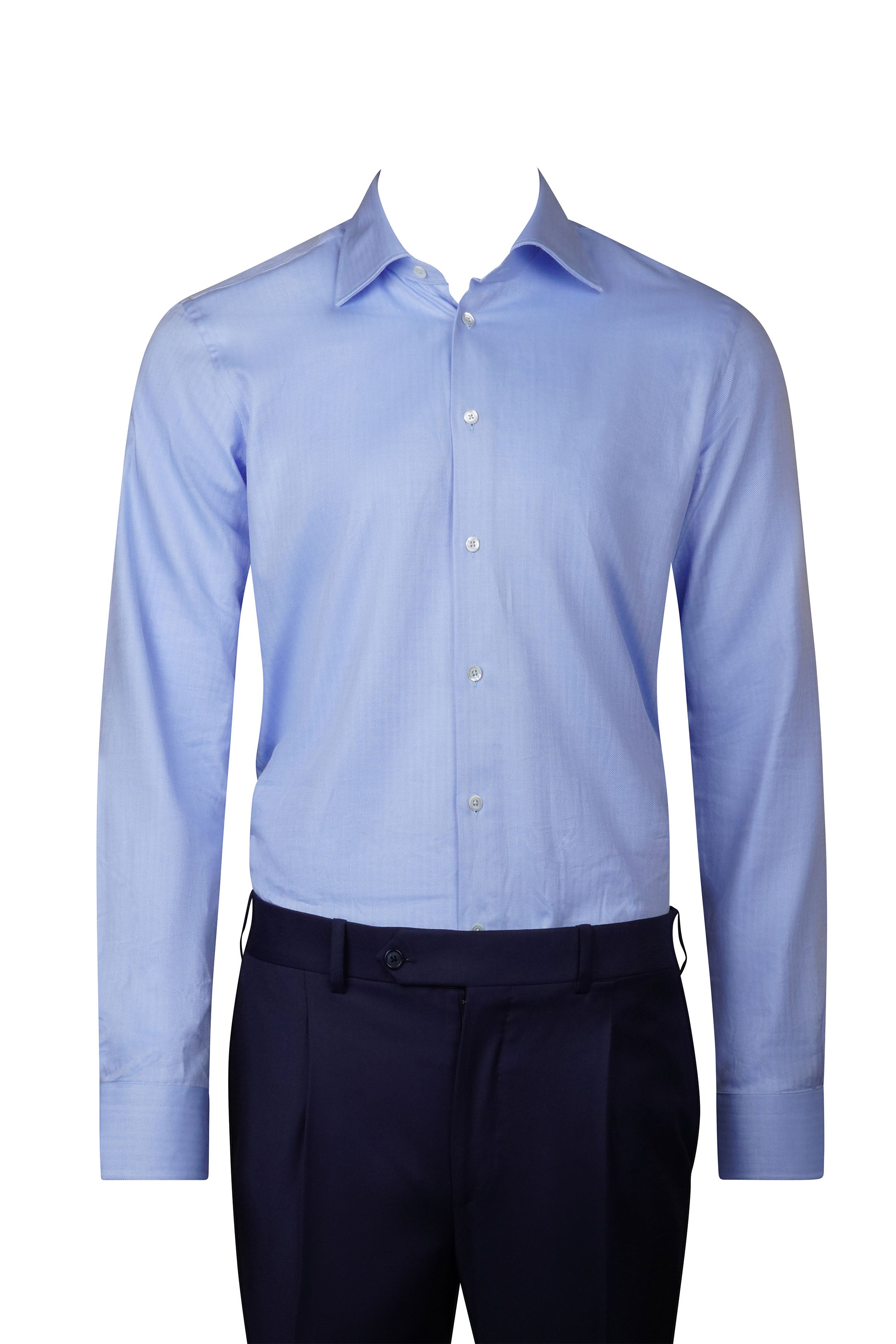 Open-front construction with single-needle stitching; 588 collar (half spread); Internal collar with reinforcements and removable stays; Smooth Front and Back; Genuine mother-of-pearl buttons