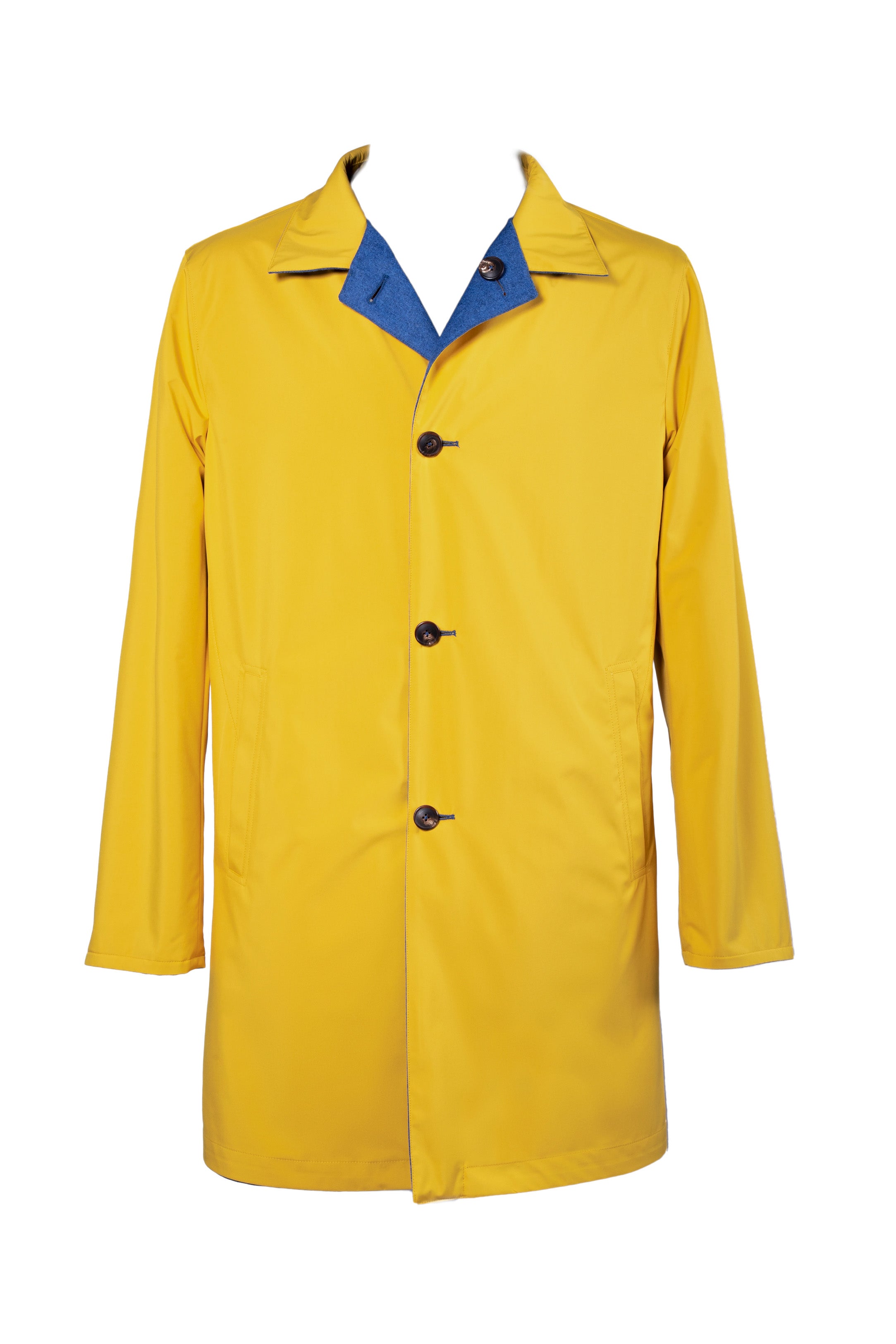 Car Coat; Reversible; Waterproof features; Shirt collar style; Inclined side pockets; Waist darting; One back vent; Genuine horn buttons; Classically constructed sleeves; Hand-sewn buttons